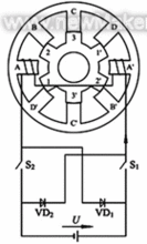 四相(8/6)結(jié)構(gòu)SR電動機原理圖。為簡單計,圖中只畫出A相繞組及其供電電路。SR電動機的運行原理遵循“磁阻最小原理”— ‘磁通總要沿著磁阻最小的路徑閉合,而具有一定形狀的鐵心在移動到最小磁阻位置時,必使自己的主軸線與磁場的軸線重合。圖2中,當(dāng)定子D-D’極勵磁時,1-1'向定子軸線D-D'重合的位置轉(zhuǎn)動,并使D相勵磁繞組的電感最大。若以圖中定、轉(zhuǎn)子所處的相對位置作為起始位置,則依次給D→A→B→C相繞組通電,轉(zhuǎn)子即會逆著勵磁順序以逆時針方向連續(xù)旋轉(zhuǎn);反之,若依次給B→A→D→C相通電,則電動機即會沿順時針方向轉(zhuǎn)動??梢?,SR電動機的轉(zhuǎn)向與相繞組的電流方向無關(guān),而僅取決于相繞組通電的順序。另外,從圖2可以看出,當(dāng)主開關(guān)器件S1、S2導(dǎo)通時,A相繞組從直流電源US吸收電能,而當(dāng)S1、S2關(guān)斷時,繞組電流經(jīng)續(xù)流二極管VD1、VD2繼續(xù)流通,并回饋給電源US。因此,SR電動機傳動的共性特點是具有再生作用,系統(tǒng)效率高。